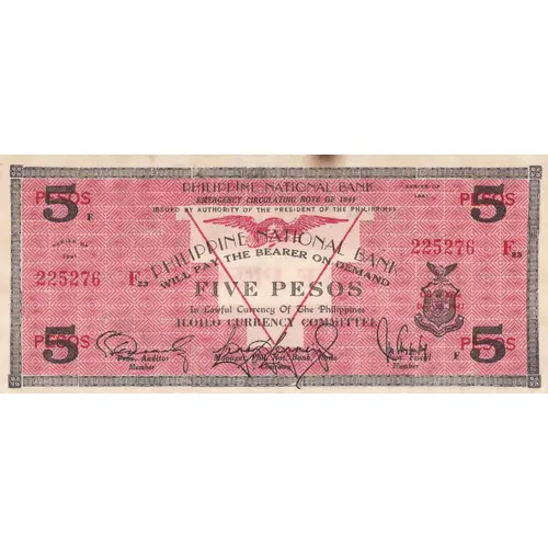 PHILIPPINE NATIONAL BANK EMERGENCY CIRCULATING NOTE OF 1941 ISSUED BY AUTHORITY OF THE PRESIDENT OF THE PHILIPPINES THE PHILIPPINE NATIONAL BANK WILL PAY THE BEARER ON DEMAND FIVE PESOS IN LAWFUL CURRENCY OF THE PHILIPPINES ILOILO CURRENCY COMMITTEE |