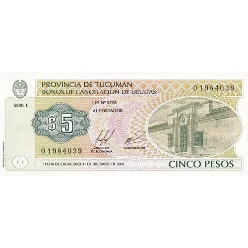| Obverse lettering | PROVINCIA DE TUCUMAN BONOS DE CANCELACION DE DEUDAS LEY N° 5728 AL PORTADOR FECHA DE CADUCIDAD 31 DE DICIEMBRE DE 2003 CINCO PESOS (Translation: PROVINCE OF TUCUMAN DEBT CANCELLATION BONDS LAW No. 5728 TO THE CARRIER EXPIRY DATE DECEMBER 31, 2003 FIVE PESOS) |