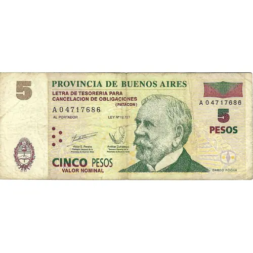 | Legenda del dritto | 5 PROVINCIA DE BUENOS AIRES LETRA DEL TESORO PARA CANCELACIÓN DE OBLIGACIONES (PATACÓN) AL PORTADOR LEY Nº 12.727 5 PESOS Víctor E. Pereira Contador General de la Provincia de Buenos Aires Amílcar Zufriategui Tesorero General de la Provincia de Buenos Aires CINCO PESOS VALOR NOMINAL DARDO ROCHA (Translation: Buenos Aires province Treasure title for payment of obligations (Patacón) To the bearer. Law # 12,727 Five pesos nominal value Dardo Rocha) |
