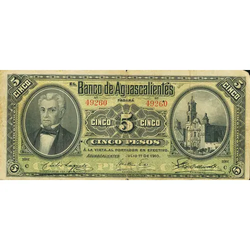 | Opschrift voorzijde | EL Banco de Aguascalientes PAGARA CINCO PESOS A LA VISTA, AL PORTADOR EN EFECTIVO AGUASCALIENTES JULIO 1º DE 1910 (Translation: The Bank of Aguascalientes will pay Five Pesos on sight, to the bearer in cash Aguascalientes July 1st 1910) |