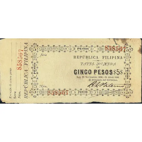| Reverse lettering | EL PRESIDENTE DE LA REPUBLICA EMILIO AGUINALDO ESTE BILLETE SERA OPORTAMENTE CAMBIADO POR LA REPUBLICA FILIPINA Y RECIBIDO REPUBLICA DE FILIPINAS CINCO PESOS REPUBLICA DE FILIPINAS EN PAGO DE CONTRIBUCIONESDERECHOS DE ADVANA Y TODO GENERO DE OBLIGACIONES EL PRESIDENTE DEL CONSEJO DE GOBIERNO, PEDRO A. PATERNO EL FALSIFICADOR SERA CASTIGADO CON TODO EL RIGOR DE LA LEY (Translation: The President of the Republic Emilio Aguinaldo This ticket will be exchanged and received by the Philippine Republic in payment of taxes, customs duties and all kind of obligations Republic of the Philippines Five pesos The President of the Governing Council Pedro A. Paterno The counterfeiter will be punished with the full rigor of the law) |