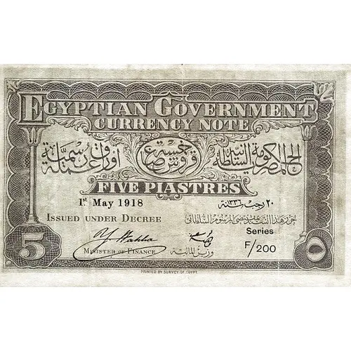 EGYPTIAN GOVERNMENT CURRENCY NOTE الحكومة السلطانية المصرية خمسة قروش صاغ أوراق عملية رسمية FIVE PIASTRES ISSUED UNDER DECREE حرر هذا السند بمقتضى المرسوم السلطانى MINSTER OF FINANCE وزير المالية |