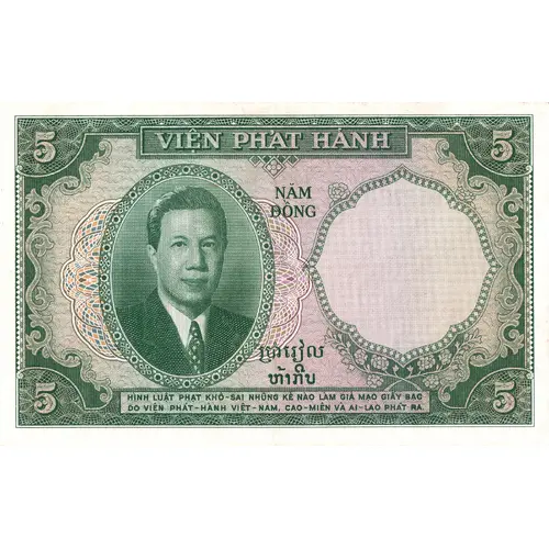 | Obverse lettering | VIỆN PHÁT HÀNH NĂM ĐỒNG ប្រាំរៀល ຫ້າກີບ (Translation: Distribution institute, Five Đồng, Five Riels, Five Kip) |