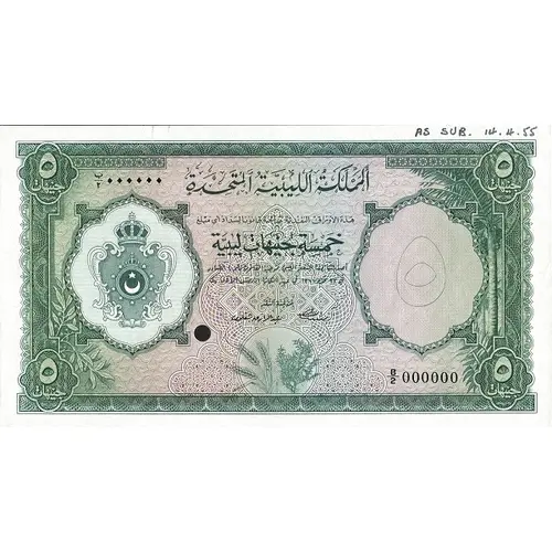 | نوشتههای روی اسکناس | UNITED KINGDOM OF LIBYA THESE CURRENCY NOTES AR LEGAL TENDER FOR THE PAYMENT OF ANY AMOUNT FIVE LIBYAN POUNDS ISSUED BY THE LIBYAN CURRENCY COMMISSION IN ACCORDANCE WITH LAW NO.4 OF 24TH OCTOBER, 1951, IN THE REIGN OF KING IDRIS I. |