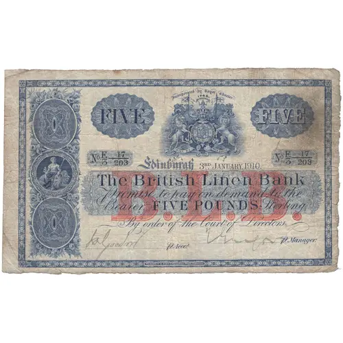 | Opis líce | Incorporated by Royal Charter 1746 The British Linen Bank Promise to Pay on Demand to the Bearer Five Pounds Sterling By order of the Court of Directors |