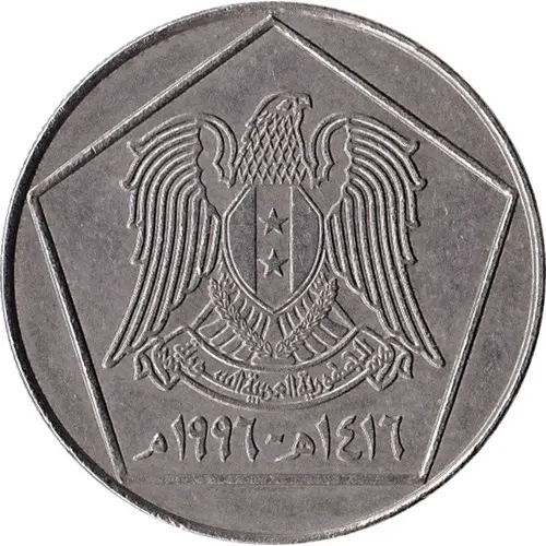 | Obverse description | Coat of arms of Syria inside a pentagon: hawk of Quraish with two stars on the shield holding a scroll with `Syrian Arab Republic` in Arabic lettering. Dates (AD left and AH right) in Arabic digits below. |