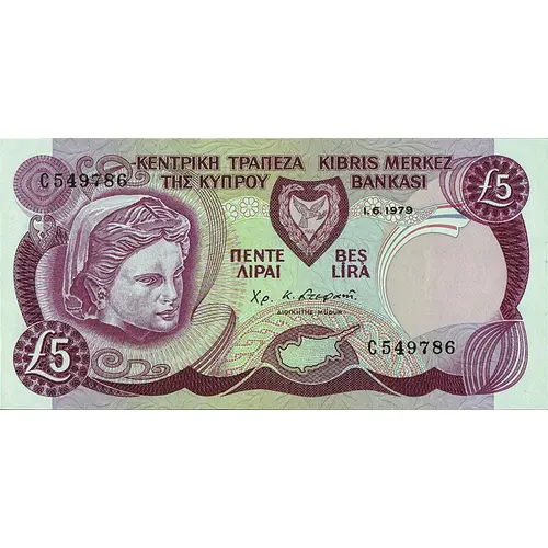 | Opis líce | ΚΕΝΤΡΙΚΗ ΤΡΑΠΕΖΑ ΤΗΣ ΚΥΠΡΟΥ KIBRIS MERKEZ BANKASI C549786 £5 1.6.1979 1960 ΠΕΝΤΕ ΛΙΡΑΙ BEŞ LİRA ΔΙΟΙΚΗΤΗΣ - MÜDÜR C549786 £5 |