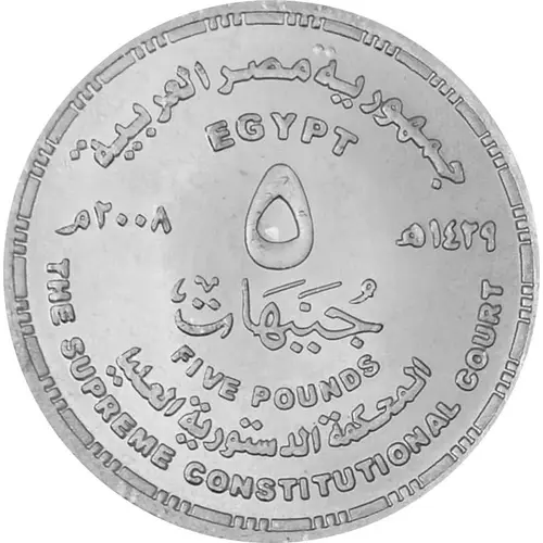 | Ön yüz lejandı | جمهورية مصر العربية Egypt ١٤٢٩ - ٢٠٠٨ ٥ جنيهات Five Pounds المحكمة الدستورية العليا The Supreme Constitutional Court (Translation: Arab Republic of Egypt Egypt 2008 - 1429 5 Pounds Five Pounds The Supreme Constitutional Court The Supreme Constitutional Court) |