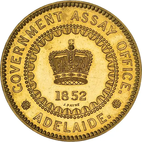 | Leyenda del anverso | GOVERNMENT ASSAY OFFICE 1852 J. PAYNE ADELAIDE |