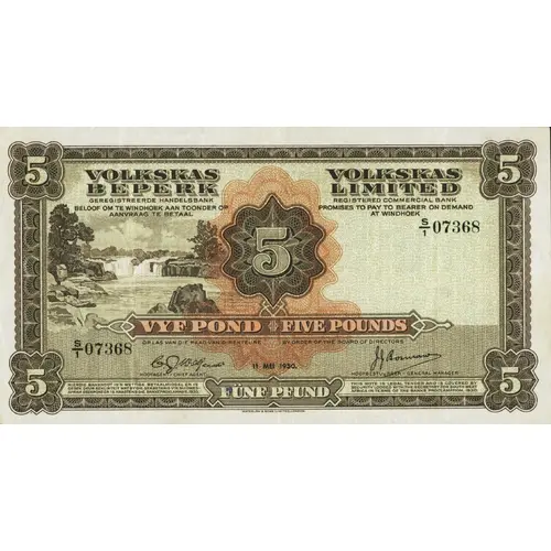 VOLKSKAS BEPERK GEREGISTREERDE HANDELSBANK BELOOF OM TE WINDHOEK AAN TOONDER OP ANVRAAG TE BETAAL VOLKSKAS LIMITED REGISTERED COMMERCIAL BANK PROMISES TO PAY TO BEARER ON DEMAND AT WINDHOEK 5 VYF POND FIVE POUNDS 11 MEI 1950. FÜNF PFUND |