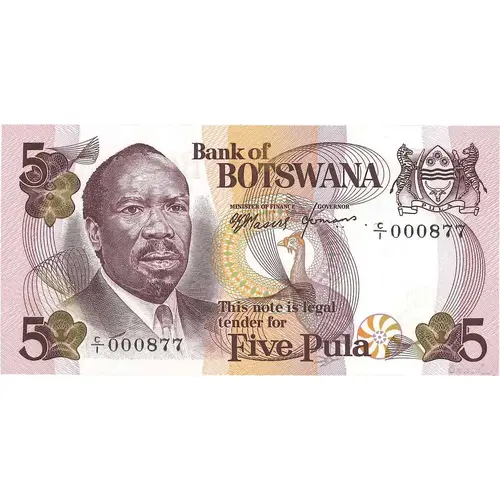 BANK OF BOTSWANA THIS NOTE IS LEGAL TENDER FOR FIVE PULA |