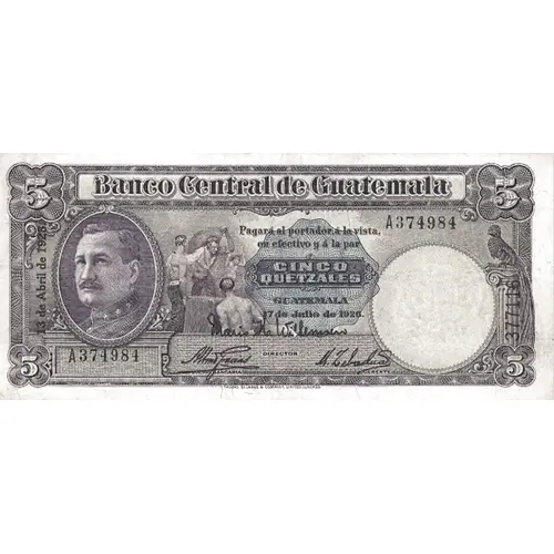 | Obverse lettering | Banco Central de Guatemala Pagará al portador á la vista en efectivo y á la par CINCO QUETZALES GUATEMALA 7 de Julio de 1926. 13 de Abril de 1928. (Translation: Central Bank of Guatemala Pay to Bearer at sight in cash Five Quetzals Guatemala, July 7th., 1926. April 13th., 1928.) |