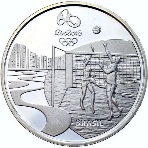 Scene depicting the practice of beach volleyball on Copacabana. Complete the composition the Rio 2016 Games logo and the legend `Brazil`. |