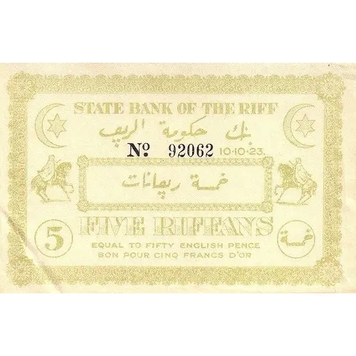 STATE BANK OF THE RIFF بنك الحكومة الريڥ خمسة ريڥانات FIVE RIFFANS EQUAL TO FIFTY ENGLISH PENCE BON POUR CINQ FRANCS D`OR |