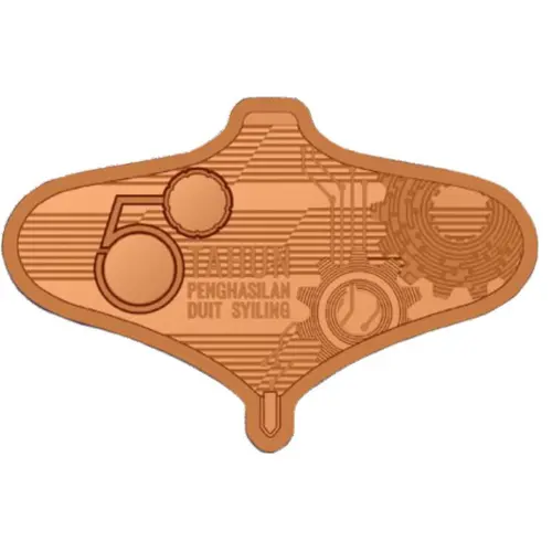 The left side features the words “50 TAHUN PENGHASILAN DUIT SYILING” to commemorate 50 years of coin minting by Kilang Wang. The numerals five and zero are styled to mimic the shape of two coins. The right side features circuitry and mechanical gears symbolising progress, modernisation and technology. The background features linear stripes depicting movement and speed, inspired by the traditional gasing leper, a traditional Malay spinning tops. |