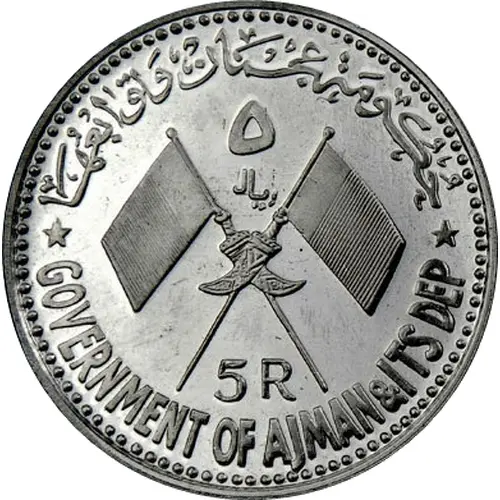 | 表面の銘文 | ★ حُكُومَة عجمَان وَتوابعُهَا ★ ٥ ريال 5 R GOVERNMENT OF AJMAN & ITS DEP (Translation: Government of Ajman and its dependencies 5 Riyals) |