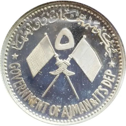 State emblem in the middle, denomination 5 in Arabic above, and Government of Ajman & Its Dep in Arabic on top and in English below |