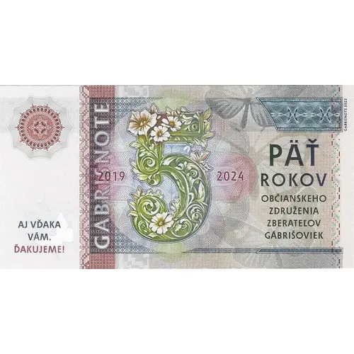 2019 5 2024 GABRISNOTE PÄŤ ROKOV OBČIANSKEHO ZDRUŽENIA ZBERATEL`OV GÁBRIŠOVIEK AJ VĎAKA VÁM. ĎAKUJEME! GABRISNOTE 2022 (Translation: 5 years of the Matej Gabris Banknote Collectors` Civic Association (OZZG - Gabrisoviek). Thank you.) |