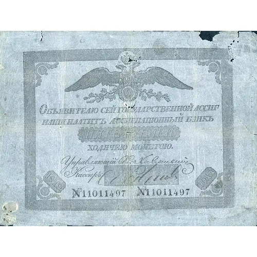 | Obverse lettering | Объявителю сей государственной ассиг- нации платитъ ассигнационный банкъ ПЯТЬ РУБЛЕЙ ходячею монетою. Управляющий Кн Хованский Кассир 1819 ГОДА (Translation: The declarant of this state banknote is paid by the bank of banknotes FIVE ROUBLES in current coin. Managing Prince Khovansky Cashier Year of 1819) |