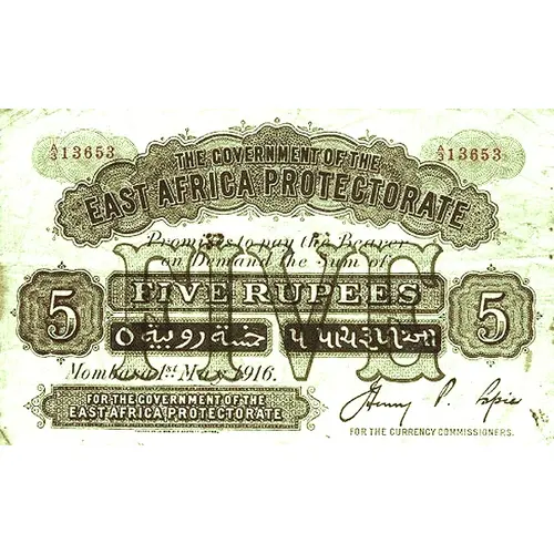 | Legenda awersu | THE GOVERNMENT OF THE EAST AFRICA PROTECTORATE PROMISES TO PAY THE BEARER ON DEMAND THE SUM OF FIVE RUPEES FOR THE GOVERNMENT OF THE EAST AFRICA PROTECTORATE |