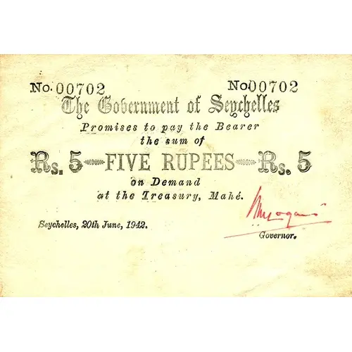 | Ön yüz lejandı | THE GOVERNMENT OF SEYCHELLES PROMISE TO PAY THE BEARER THE SUM OF FIVE RUPEES ON DEMAND AT THE TREASURY, MAHÉ |