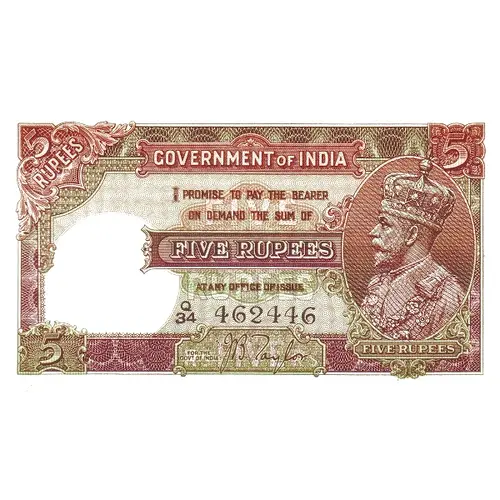 GOVERNMENT OF INDIA I PROMISE TO PAY THE BEARER ON DEMAND THE SUM OF FIVE RUPEES AT ANY OFFICE OF ISSUE |