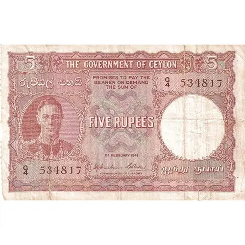 | Obverse lettering | THE GOVERNMENT OF CEYLON PROMISES TO PAY THE BEARER ON DEMAND THE SUM OF FIVE RUPEES 1st. FEBRUARY 1941 |