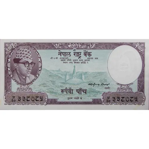 | Description de l’avers | Purple frame with a green center. Portrait of King Mahendra (L.), Swayambhunath Temple (C.), Watermark Window - Watermark of Crown (R.) |