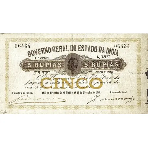 | Legenda do anverso | Governo Geral do Estado da India 5 RUPIAS |