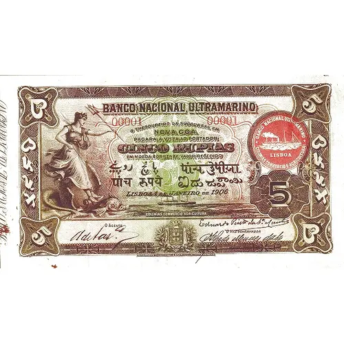 | Надписи лицевой стороны | BANCO NACIONAL ULTRAMARINO NOVA GOA CINCO RUPIAS LISBOA, 1deJANEIOde1906 |