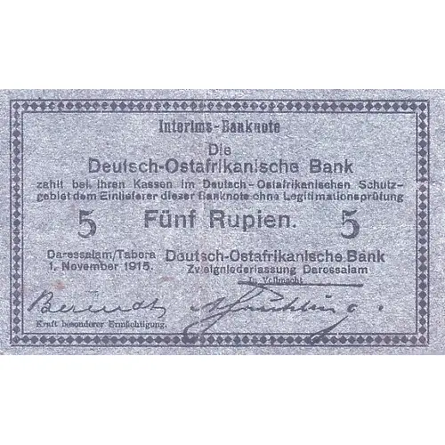 | Vorderseitenbeschreibung | Daressslam/Tabora in one line at left. Text ` Kraft besonderer Ermächtigung` at lower left. Both signatures stamped |