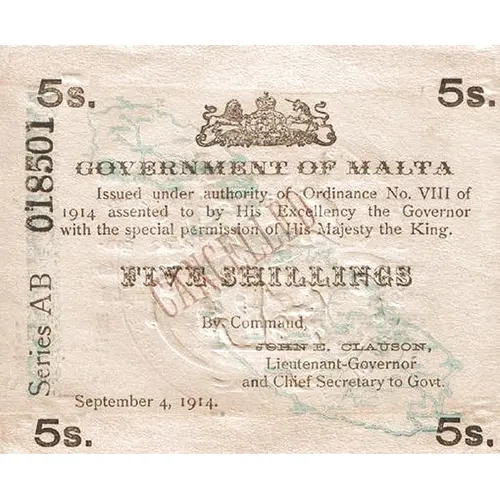 5s. 5s. GOVERNMENT OF MALTA Issued under authority of Ordinance No. VIII of 1914 assented to by His Excellency the Governor with the special permission of His Majesty the King. FIVE SHILLINGS By Command, JOHN E. CLAUSON, Lieutenant-Governor and Chief Secretary to Govt. September 4, 1914. 5s. 5s. |