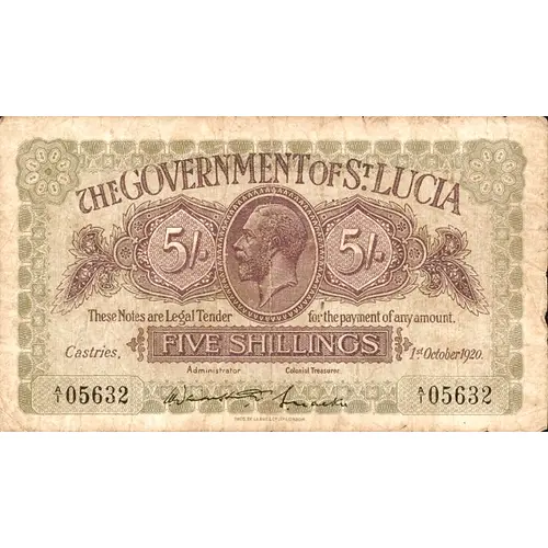 THE GOVERNMENT OF ST. LUCIA These Notes are Legal Tender for the payment of any amount. FIVE SHILLINGS Castries, 1st. October 1920 |
