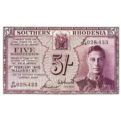 Legenda do anverso SOUTHERN RHODESIA CURRENCY NOTES ARE LEGAL TENDER FOR THE PAYMENT OF ANY AMOUNT FIVE SHILLINGS ISSUED IN TERMS OF THE COINAGE AND CURRENCY ACT 1938 AS AMENDED FOR THE SOUTHERN THODESIA CURRENCY BOARD
