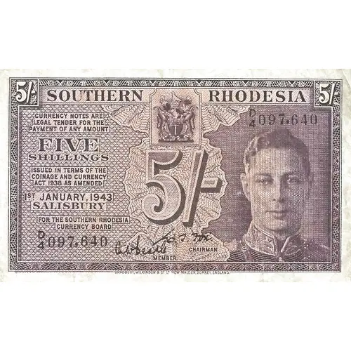 | نوشتههای روی اسکناس | SOUTHERN RHODESIA CURRENCY NOTES ARE LEGAL TENDER FOR THE PAYMENT OF ANY AMOUNT FIVE SHILLINGS ISSUED IN TERMS OF THE COINAGE AND CURRENCY ACT 1938 AS AMENDED FOR THE SOUTHERN THODESIA CURRENCY BOARD |