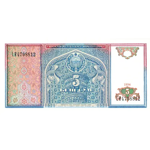 | Leyenda del anverso | ЎЗБЕКИСТОН РЕСПУБЛИКАСИ МАРКАЗИЙ БАНКИ 5 БЕШ СЎМ ЎЗБЕКИСТОН СЎМИ РЕСПУБЛИКА ҲУДУДИДА ХАММА ТЎЛОВАР УЧУН ЎЗ ҚИЙМАТИ БЎЙИЧА ҚАБУЛ ҚИЛИНИШИ ШАРТ (Translation: Central Bank of the Republic of Uzbekistan, Five So‘m, The Uzbek so‘m must be accepted at face value for all payments in the republic) |