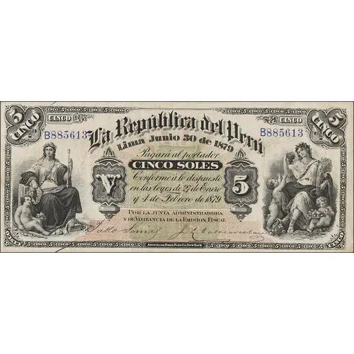 | Legenda del dritto | LA REPÚBLICA DEL PERÚ Lima Junio 30 de 1879 Pagará al portador CINCO SOLES Conforme á lo dispuesto en las leyes de 27 de Enero y 4 de Febrero de 1879 POR LA JUNTA ADMINISTRADORA Y DE VIJILANCIA DE LA EMISION FISCAL (Translation: The Republic of Peru Lima, June 30th., 1879 Will pay to the bearer Five Soles (Suns) Accordingly to stated on Laws from January 27th. & February 4th., 1879 By Administrative and Oversight Board of Fiscal Issue) |