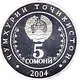 | Légende de l’avers | • ҶУМҲУРИИ ТОҶИКИСТОН • 5 СОМОНӢ 2004 СПМД (Translation: Republic of Tajikistan 5 Somonii SPMD (St. Petersburg mint mark)) |
