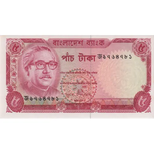 | Obverse lettering | বাংলাদেশ ব্যাংক পাঁচ টাকা চাহিবা মাত্র ইহার বাহককে দিতে বাধ্য থাকিবে গণপ্রজাতন্ত্রী বাংলাদেশদেশ সরকারের দায়িত্বে প্রবর্তিত আ.ন. হামিদ উল্লাহ্ গভর্নর (Translation: BANGLADESH BANK FIVE TAKA A. N. HAMID ULLAH GOVERNOR) |