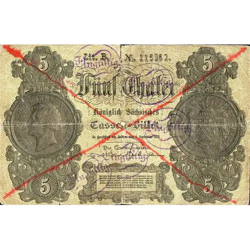 Reverse description Lettering (regular font): Fünf Thaler Königlich Sächsisches Cassen-Billet. In Gemäßheit des Gesetzes vom 6. September 1855. Die Commißsarien: