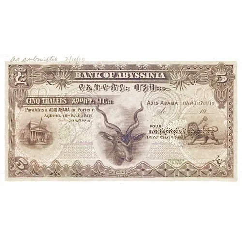 | Legenda awersu | BANK OF ABYSSINIA የኢትዮጵያ፡ባንክ። CINQ THALERS አምስት፡ብር። PAYABLES IN ADDIS ABABA AU PORTEUR (Translation: Bank of Ethiopia Five Birr) |