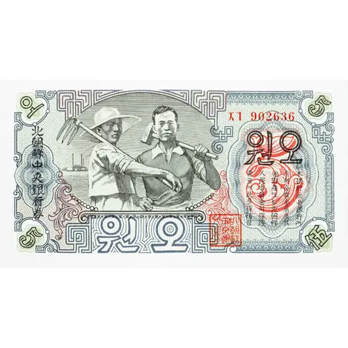 | Opis líce | 北朝鮮中央銀行券 원오 (Translation: Banknote of the Central Bank of North Korea 5 Won) |