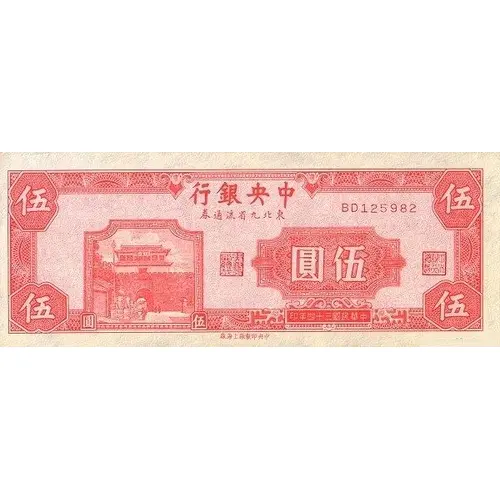 | Opis líce | 行銀央中 券通流省九北東 圓伍 印年四十三國民華中 廠海上廠製印央中 (Translation: Central Bank of China Circulation Notes in Northeastern 9 Provinces Five Yuan Printed in the 34th year of the Republic of China Central Engraving and Printing Plant, Shanghai Factory) |