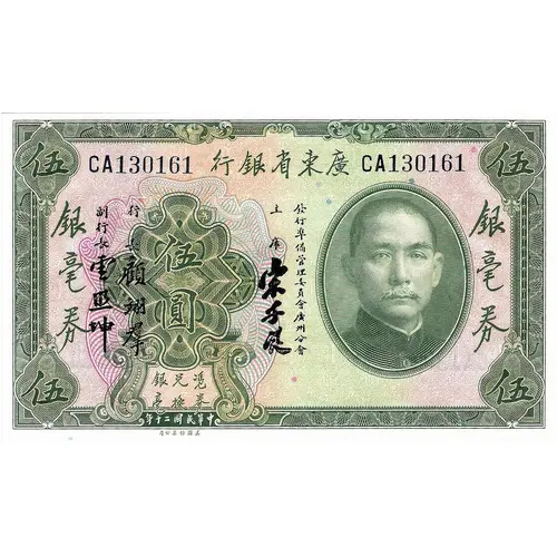 廣東省銀行 銀毫券 伍圓 憑券兌換銀毫 中華民國二十年 美國鈔票公司 (Translation: Kwangtung Provincial Bank Silver Cent Note 5 Yuan (5 Dollars) Redeem Silver Cent with this note 20th years of the Republic of China American Bank Note Company) |