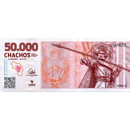 Obverse lettering 50.000 CHACHOS (BONO de CANCELACIÓN de DEUDA) AL PORTADOR LEY 10.703 LA RIOJA Gobierno Ángel Vicente Peñaloza