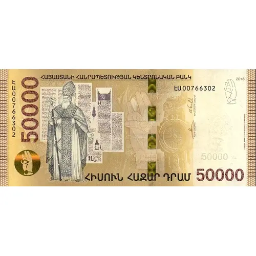 (Translation: CENTRAL BANK OF THE REPUBLIC OF ARMENIA FIFTY THOUSAND DRAMS)