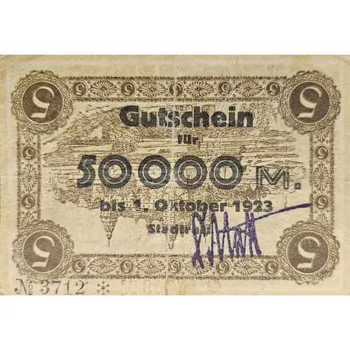 | Legenda del dritto | Gutschein fur 50 000 M. bis 1 Oktober 1923 Stadtrat: (Translation: Coupon for 50,000 m. until October 1, 1923 City council:) |