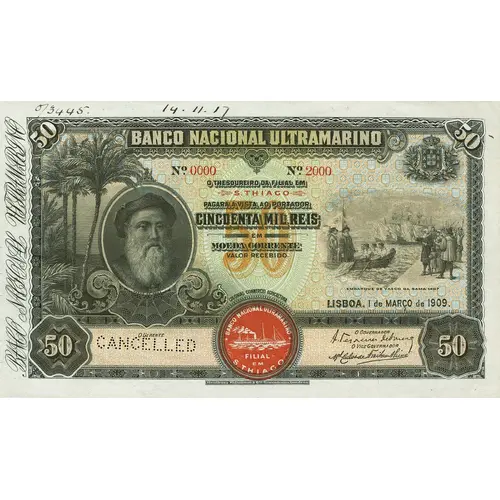 | Obverse lettering | BANCO NACIONAL ULTRAMARINO O THESOUREIRO DA FILIAL EM S. THIAGO PAGARÁ Á VISTA AO PORTADOR CINCOENTA MIL REIS EM MOEDA CORRENTE VALOR RECEBIDO LISBOA. 1 de MARÇO de 1909. (Translation: National Bank Overseas The Treasurer of the Agency of St. Thiago Pay in cash by carrier Fifty Thousand Reis in currency Amount received Lisbon, March 1st, 1909.) |