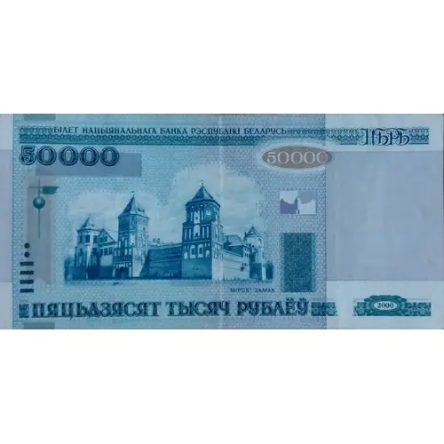 | Obverse lettering | БІЛЕТ НАЦЫЯНАЛЬНАГА БАНКА РЭСПУБЛІКІ БЕЛАРУСЬ НРБР 50 000 МІРСКІ ЗАМАК ПЯЦЬДЗЯСЯЦЬ ТЫСЯЧ РУБЛЁЎ 2000 (Translation: Payment ticket of the National Bank of the Republic of Belarus, NBRB, Mir Castle Complex, Fifty Thousand Rubles) |