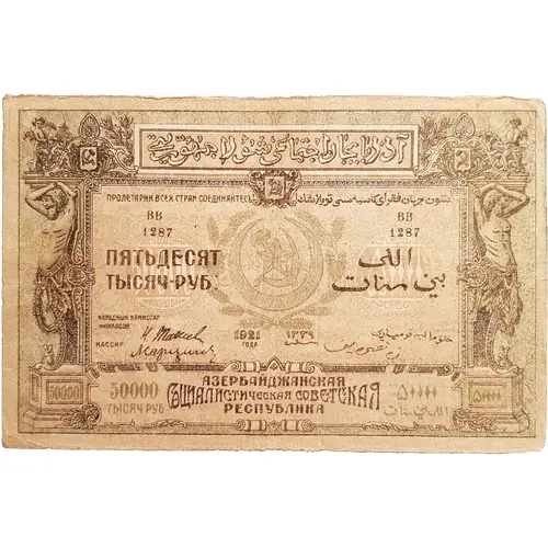| Legenda del dritto | آذربایجان شورﺎ جومهوریتی ПЯТЬДЕСЯТ اللى ТЫСЯЧ-РУБ. بين منات АЗЕРБАЙДЖАНСКАЯ СОЦИАЛИСТИЧЕСКАЯ СОВЕТСКАЯ РЕСПУБЛИКА (Translation: Socialist Republic of Azerbaijan, Fifty Thousand Roubles/Manat, Azerbaijan Soviet Socialist Republic) |